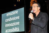 Valerio Saffirio (Orange Comunicazione Srl) presenta i GoogleGlass4Lis. Sullo sfondo alcune parole chiave legate al nostro progetto: Emozione, Condivisione, Innovazione, Accessibilità.